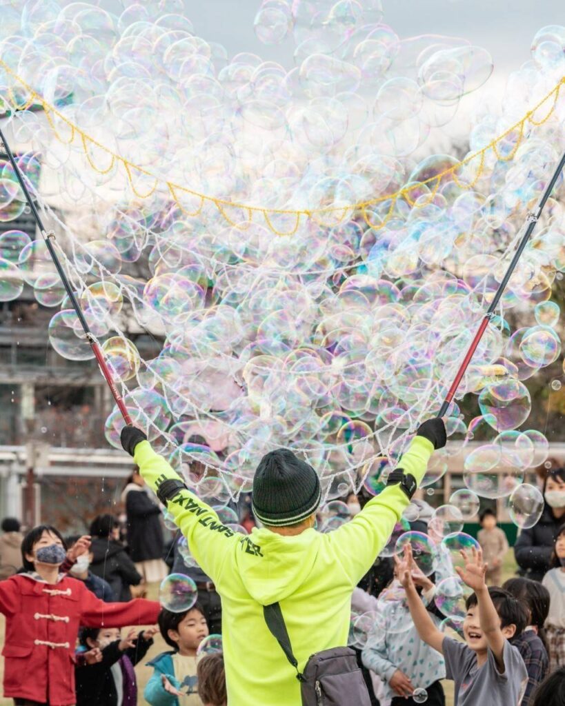 4月18日(土)安満遺跡公園ふわふわドーム近くでしゃぼた一門によるシャボン玉イベントを行います!
